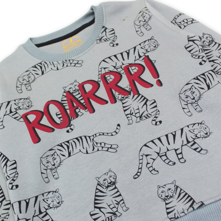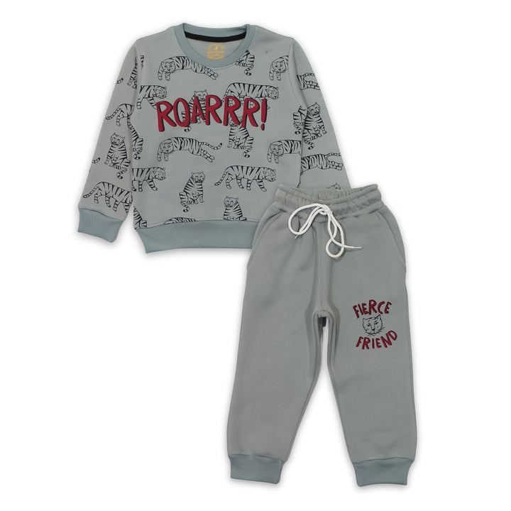 Keep your little one cozy and stylish with our Boy Gray Roarr Tigher 2 Pc set! This adorable set includes a super soft sweatshirt and trousers, featuring a cute Tiger print. Made from high-quality fleece, it ensures warmth and comfort for your child.