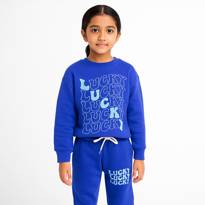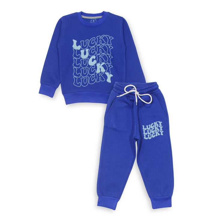 Keep your little one cozy and stylish with our Boy Royal Blue Lucky 2 Pc Set This adorable set includes a super soft sweatshirt and trousers, featuring a Lucky Text with High Density print. Made from high-quality Fleece Fabric, it ensures warmth and comfort for your child.