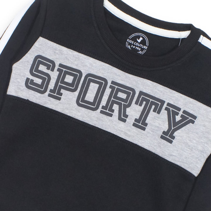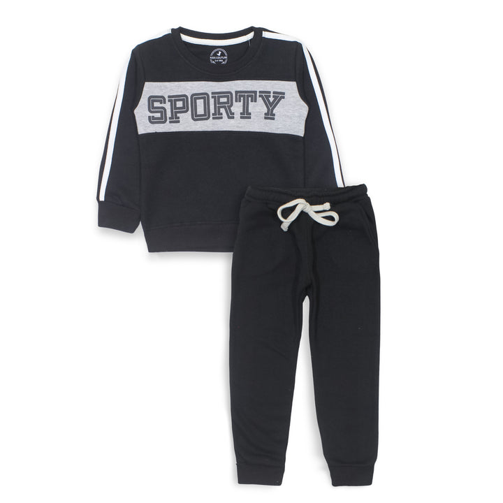 Keep your little one cozy and stylish with our Boy Black Sporty 2 Pc Set! This adorable set includes a super soft sweatshirt and trousers, featuring a Sporty Text with High Density print. Made from high-quality Fleece Fabric, it ensures warmth and comfort for your child.