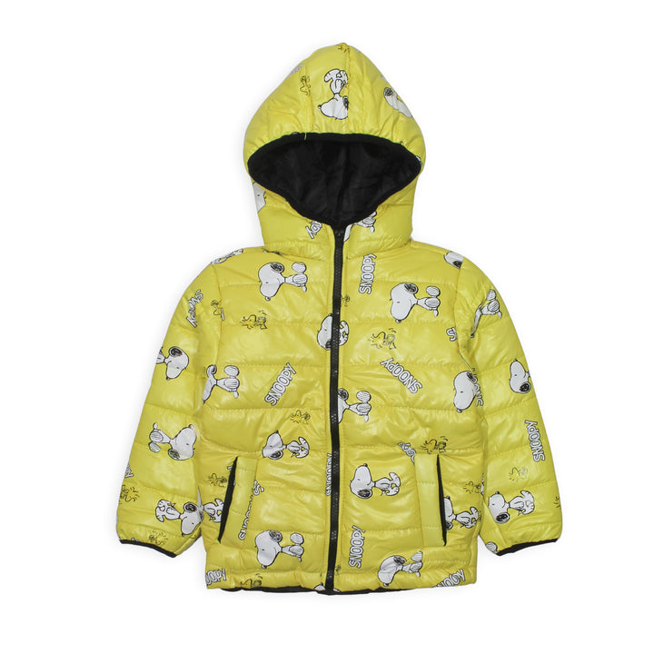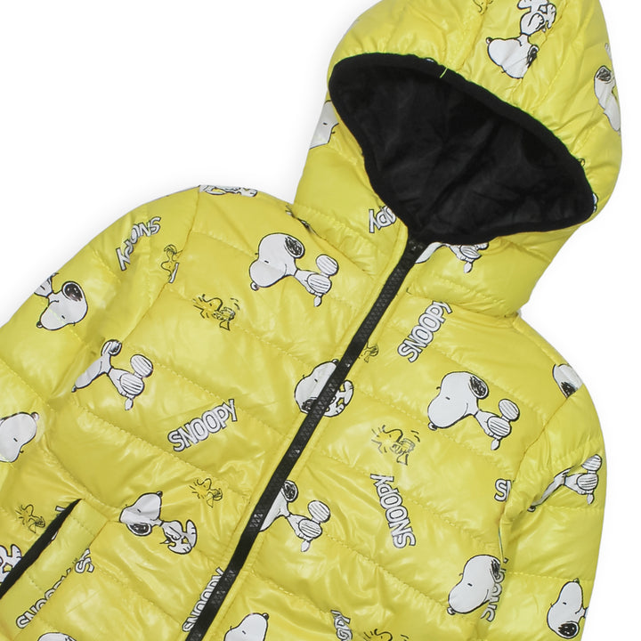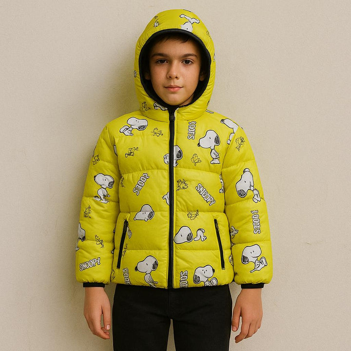 Keep your child warm and looking stylish with this Boy Yellow Snoopy Hoodie Jacket. Made with a quilted padded design, it ensures excellent insulation while staying lightweight and comfortable. The jacket features a soft hood to protect against chilly winds and a cute vibrant all over Snoopy print , adding a playful touch kids will love.