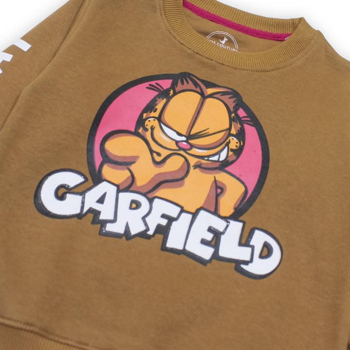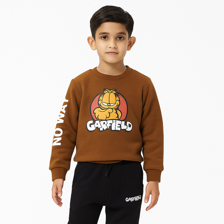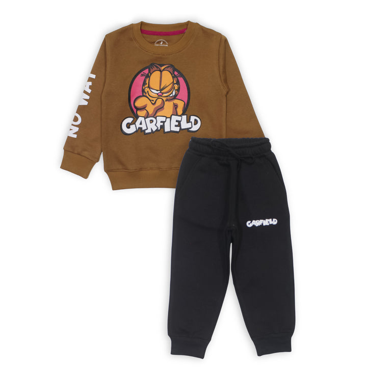set featuring the popular cartoon character Garfield. The set includes a brown long-sleeved sweatshirt with a large graphic of Garfield and the word "GARFIELD" printed on the front, It also includes a pair of black joggers with "GARFIELD" printed on the upper right leg.