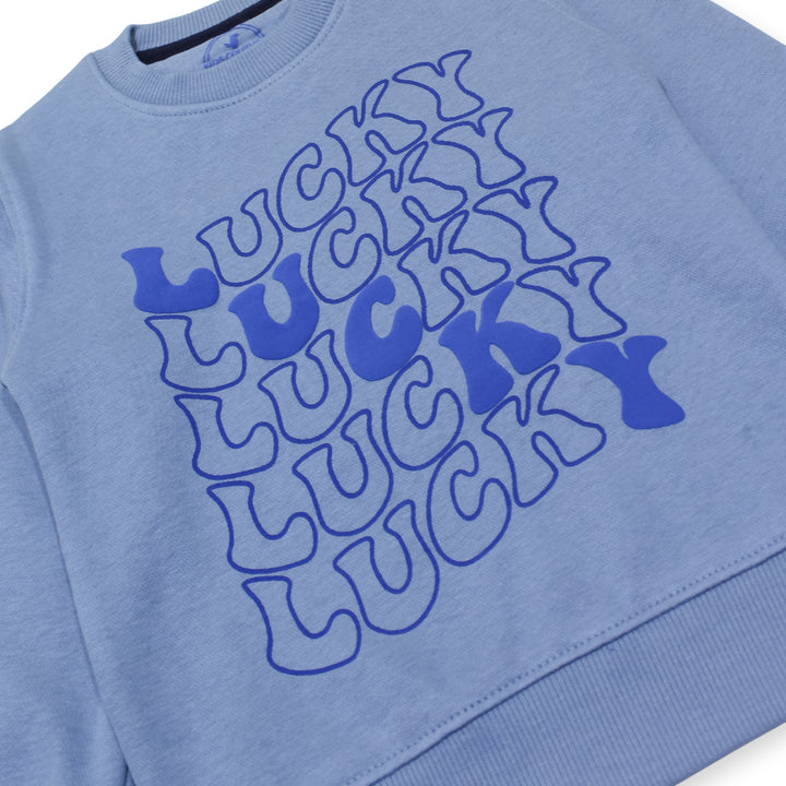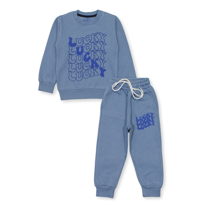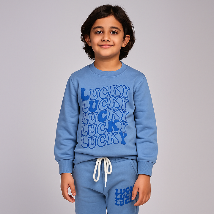Keep your little one cozy and stylish with our Boy Sky Blue Lucky 2 Pc Set This adorable set includes a super soft sweatshirt and trousers, featuring a Lucky Text with High Density print. Made from high-quality Fleece Fabric, it ensures warmth and comfort for your child.