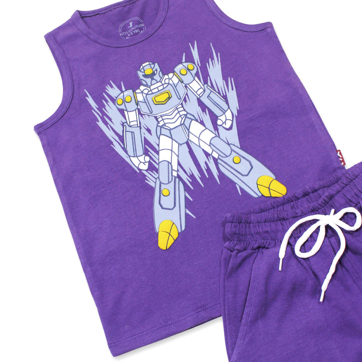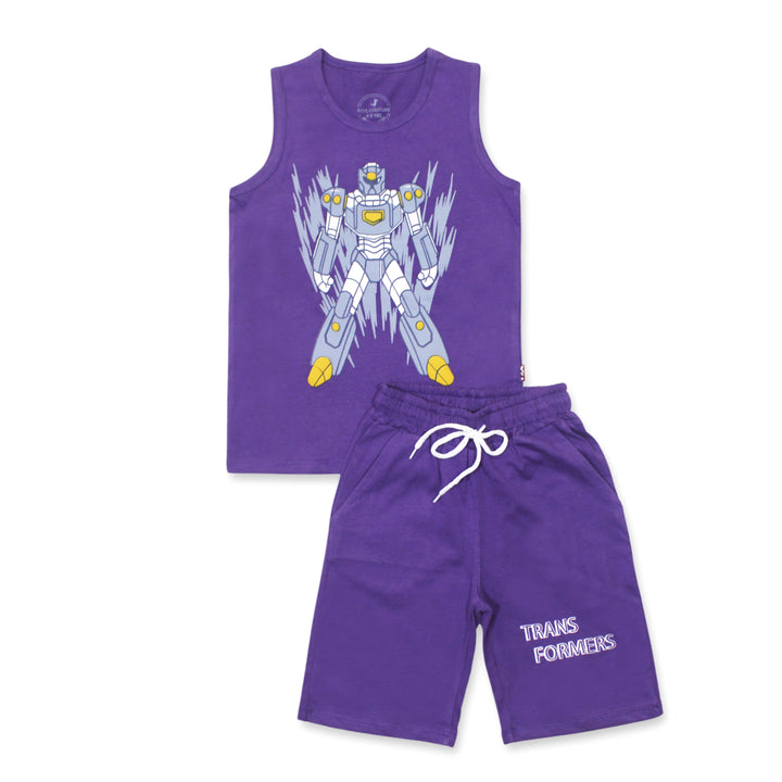 An ultra-soft, premium quality Boy Sando Purple Transformers 2 Pc set kids best thing 2-piece set consisting of a cotton jersey fabric T-shirt and shorts by Kids Couture. Non-allergic fabric gentle to baby's skin. Perfect for the summer season