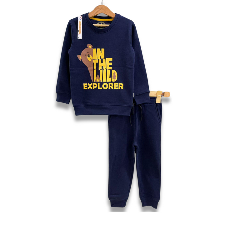 Premium Quality, Super Soft warm and cozy Gray Sweatshirt and navy trouser Bear In The Explorer Printed by kids Couture for all the kids ages. High quality printing and embellishment made with combed yarns with high quality and durability. perfect for your loved Once.