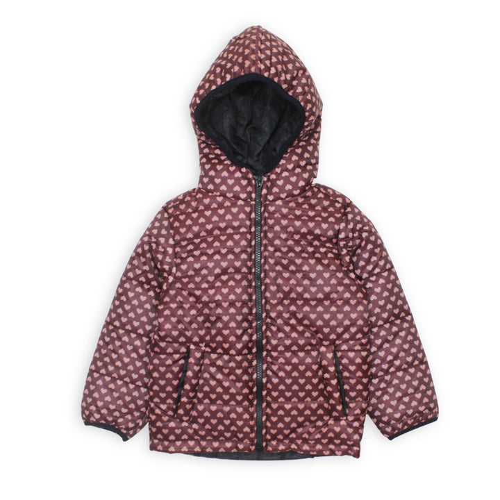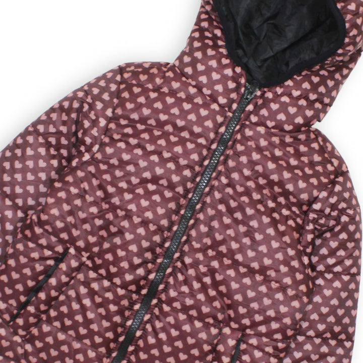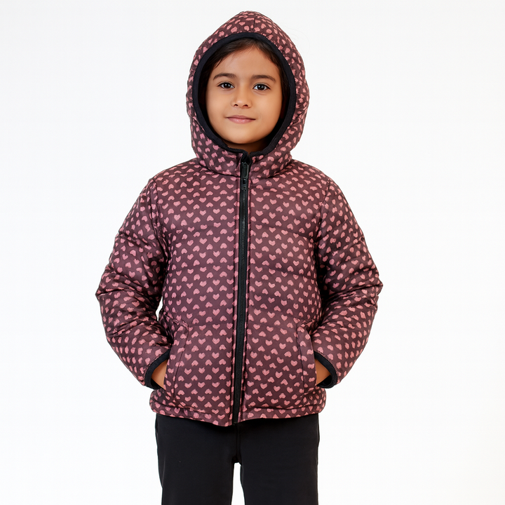 Keep your little one cozy and stylish with this trendy Girls Maroon Heart Pattern Hoodie Jacket. Designed with a quilted padded finish, it provides warmth without feeling too heavy. The jacket comes with a soft hood lining for extra comfort on chilly days.