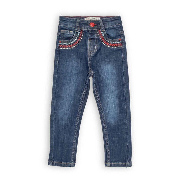 Introduce timeless style to your child's wardrobe with our Girls Dark Blue Jeans Embroidered. Crafted from premium quality twill waved denim, these jeans offer the perfect blend of style, comfort, and durability. The smart fit pattern and adjustable waistband ensure a tailored fit as your child grows.