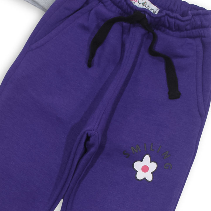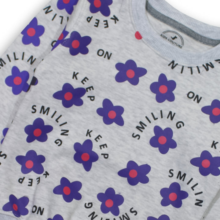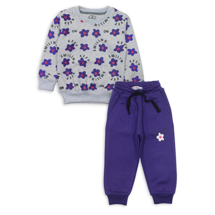 Keep your little one cozy and stylish with our Girls Light Gray Smiling Flower 2 Pc Set! This adorable set includes a super soft sweatshirt and trousers, featuring a cute all over Flower print in Front of sweatshirt. Made from high-quality fleece, it ensures warmth and comfort for your child.