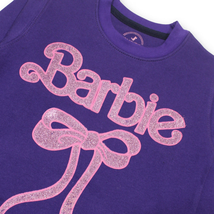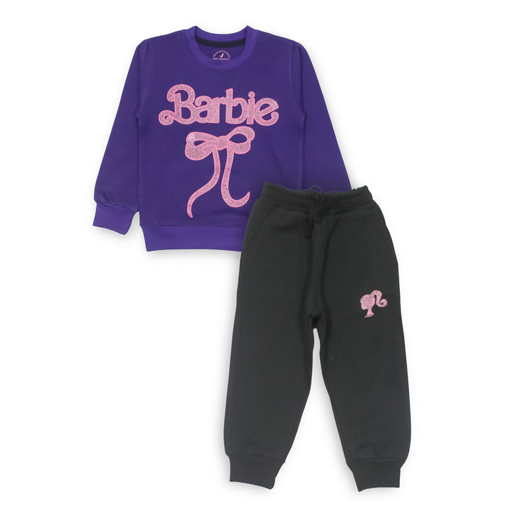 Keep your little one cozy and stylish with our Girls Purple Barbie Ribbon 2 Pc set ! This adorable set includes a super soft sweatshirt with Glitter print Barbie and trousers, featuring a cute Barbie print. Made from high-quality fleece, it ensures warmth and comfort for your child.
