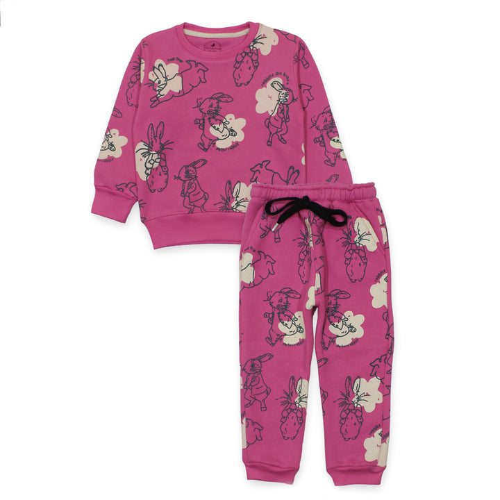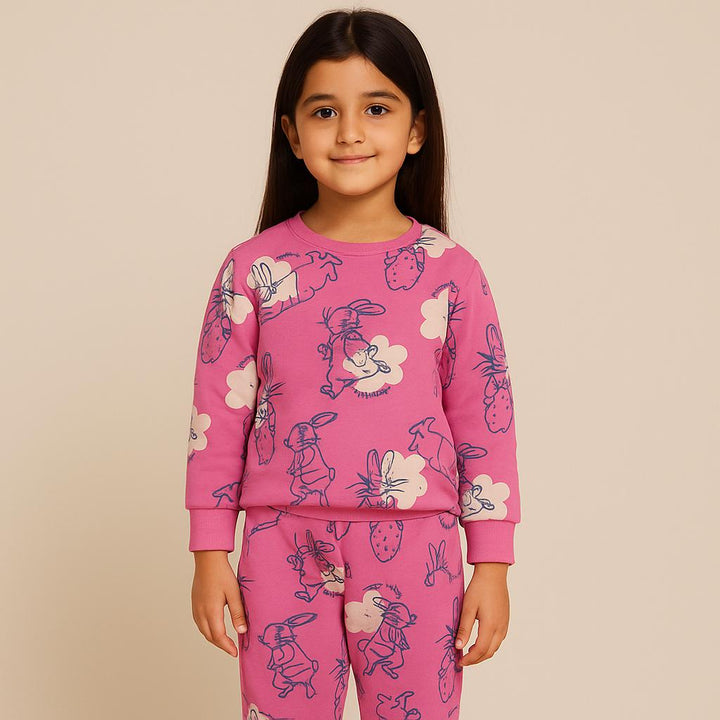 Keep your little one cozy and stylish with our Girls Pink Rabbit Pattern 2 Pc set! This adorable set includes a super soft sweatshirt and trousers, featuring a cute Rabbit print . Made from high-quality fleece, it ensures warmth and comfort for your child.