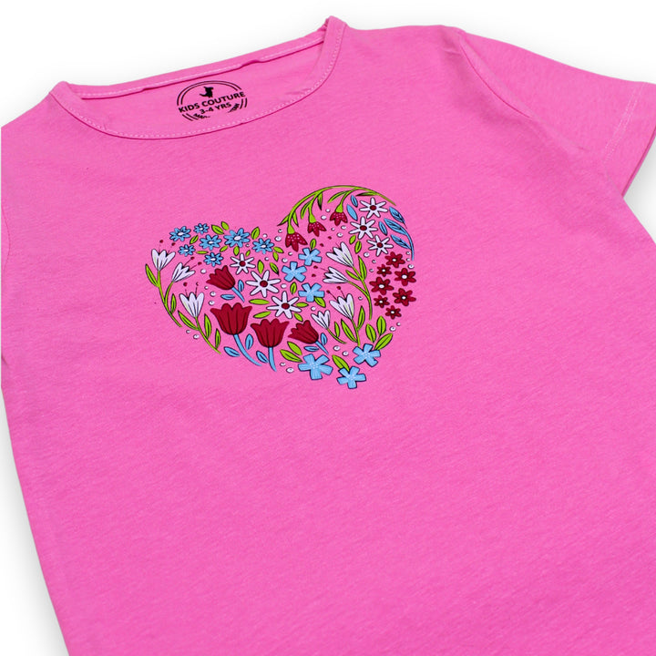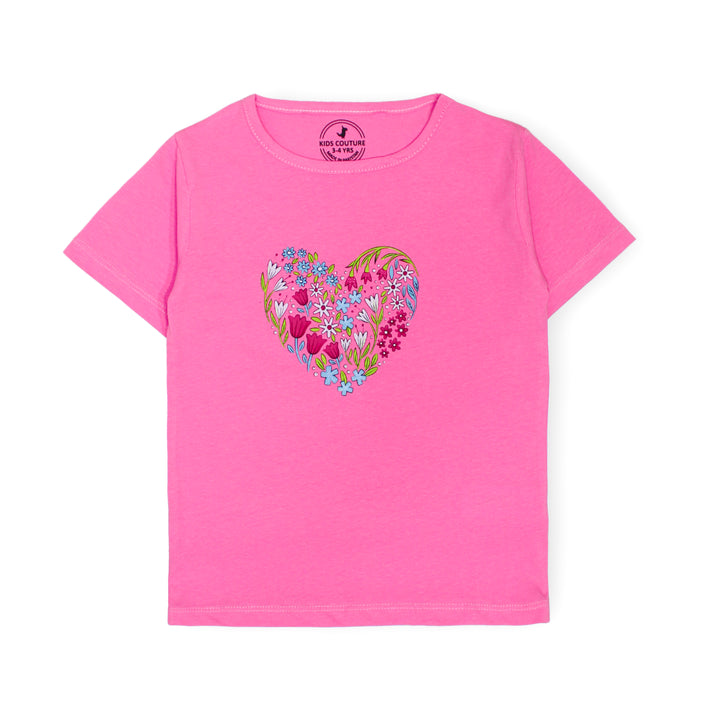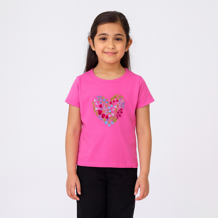 Add a touch of fun to your child's wardrobe with our Girls Pink Flower Heart T Shirt This vibrant tee is perfect for spreading joy and positivity. Crafted from high-quality jersey fabric, it ensures both comfort and style for your little one.