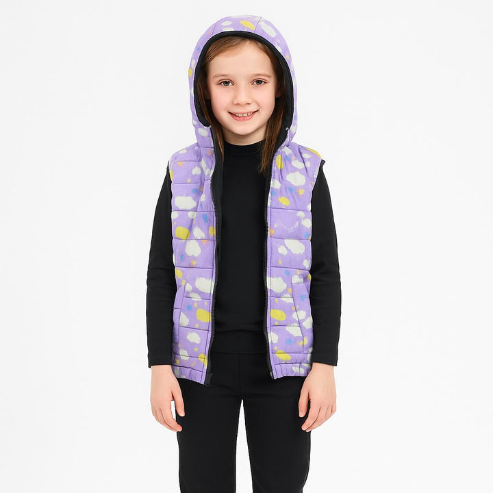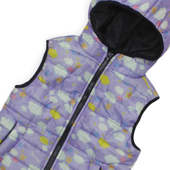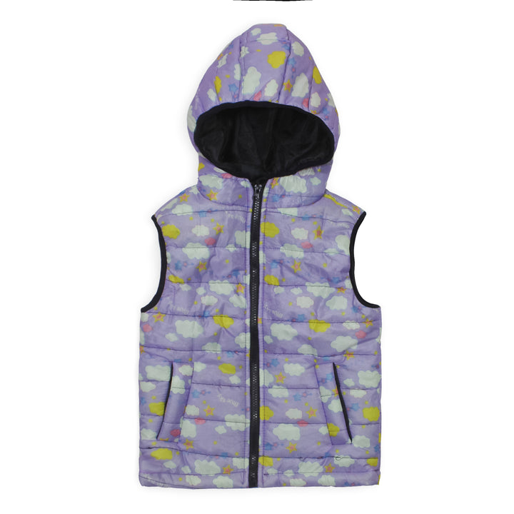 Keep your little one cozy and stylish with this trendy Girls Purple cloud & Heart vest with Hood. Designed with a quilted padded finish, it provides warmth without feeling too heavy. The jacket comes with a soft hood lining for extra comfort on chilly days.