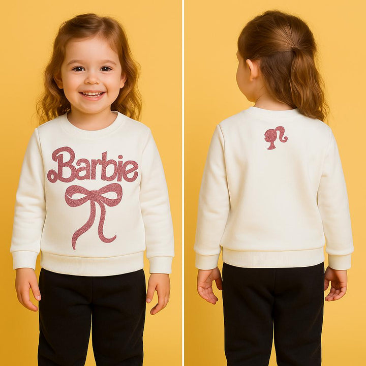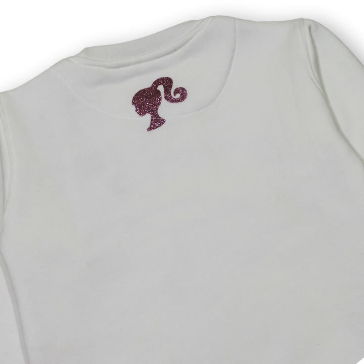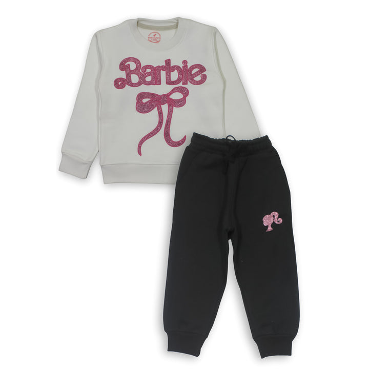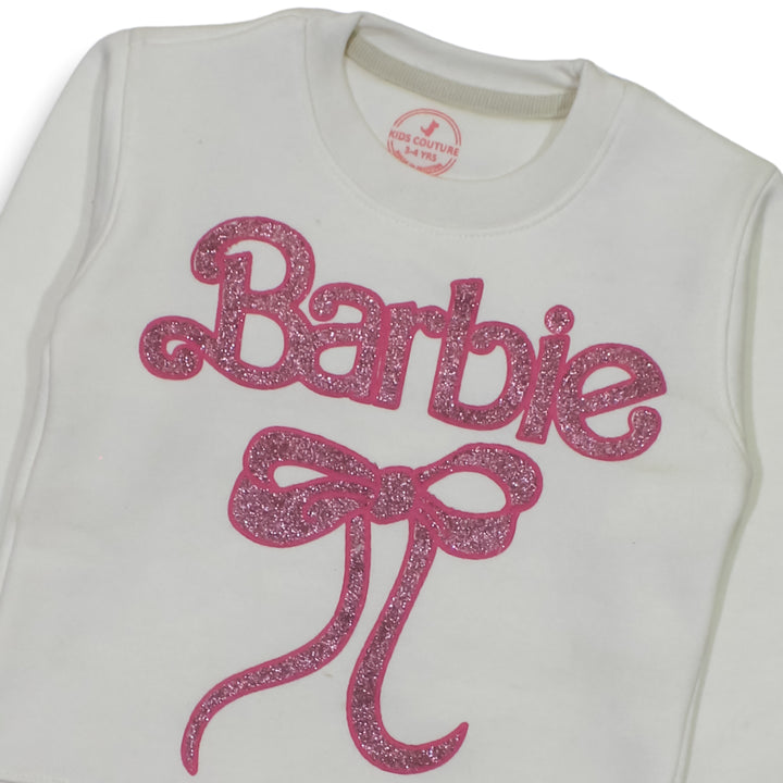 Keep your little one cozy and stylish with our Girls White Barbie Ribbon 2 Pc set ! This adorable set includes a super soft sweatshirt with Glitter print Barbie and trousers, featuring a cute Barbie print. Made from high-quality fleece, it ensures warmth and comfort for your child.