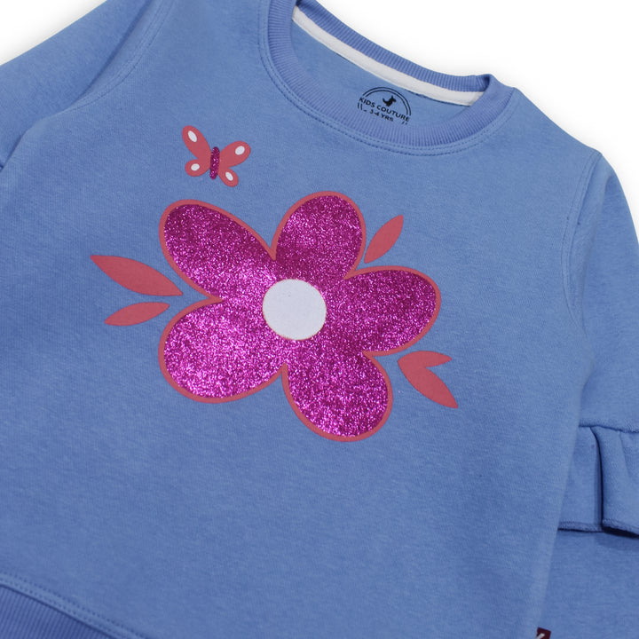 Sweatshirt: The top is a Sky Blue fleece pullover sweatshirt with long sleeves and ruffled accents at the shoulders. It is adorned with a large pink flower graphic and small butterfly accents on the front.
