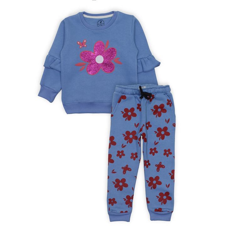 Keep your little one cozy and stylish with our Girls Sky Blue Glitter Flower 2 Pc set! This adorable set includes a super soft sweatshirt and trousers, featuring a cute Glitter Flower print. Made from high-quality fleece, it ensures warmth and comfort for your child.