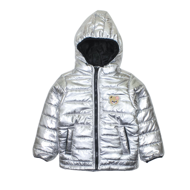 Keep your little one cozy and stylish with this trendy silver metallic puffer jacket. Designed with a quilted padded finish, it provides warmth without feeling too heavy. The jacket comes with a soft hood lining for extra comfort on chilly days.