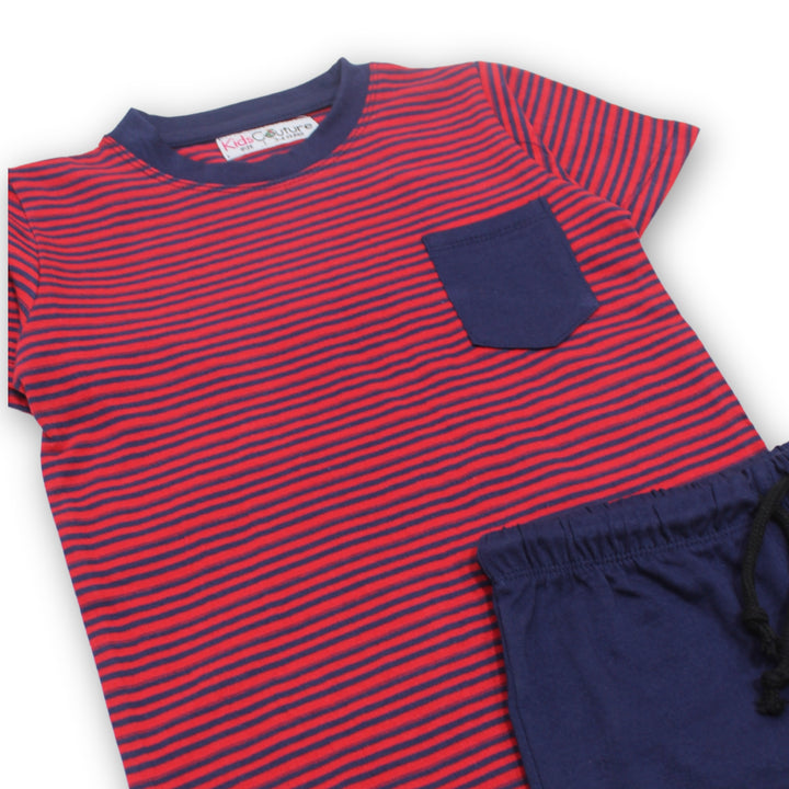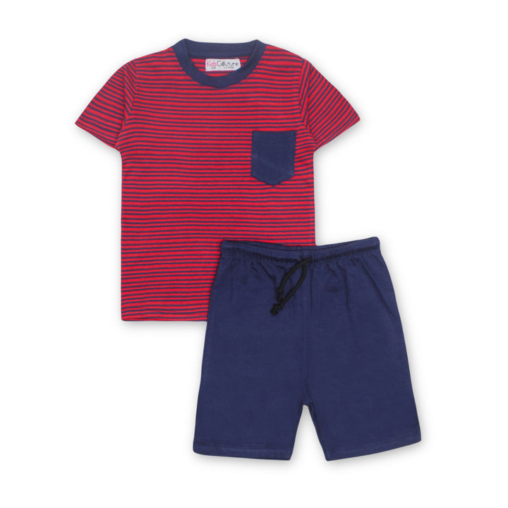 An ultra-soft, premium quality Boy Red stripes 2 Pc set kids best thing 2-piece set consisting of a cotton jersey fabric T-shirt and shorts by KidsCouture. Non-allergic fabric, gentle to baby's skin. Perfect for the summer season.