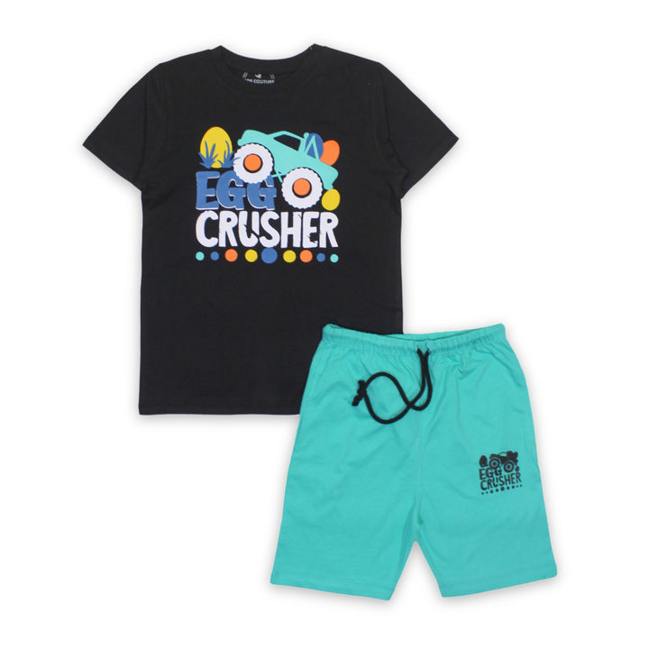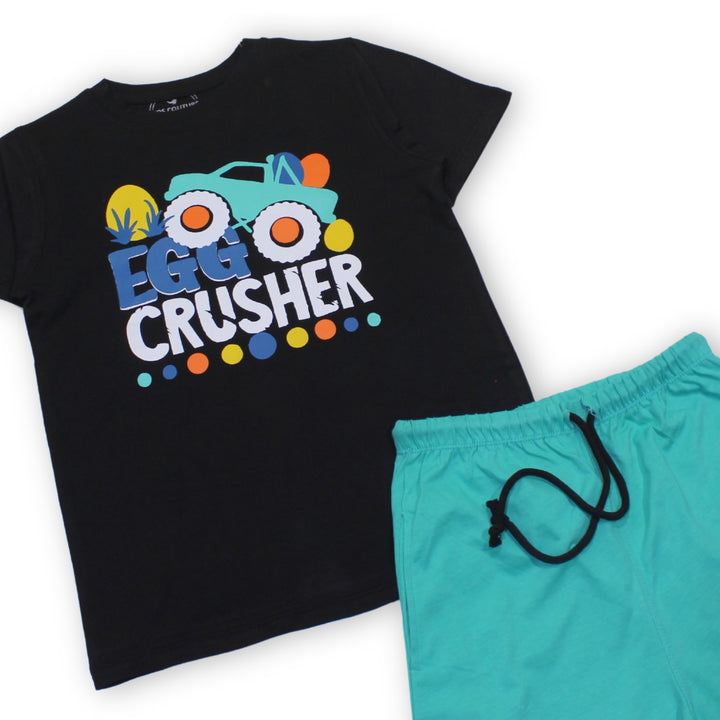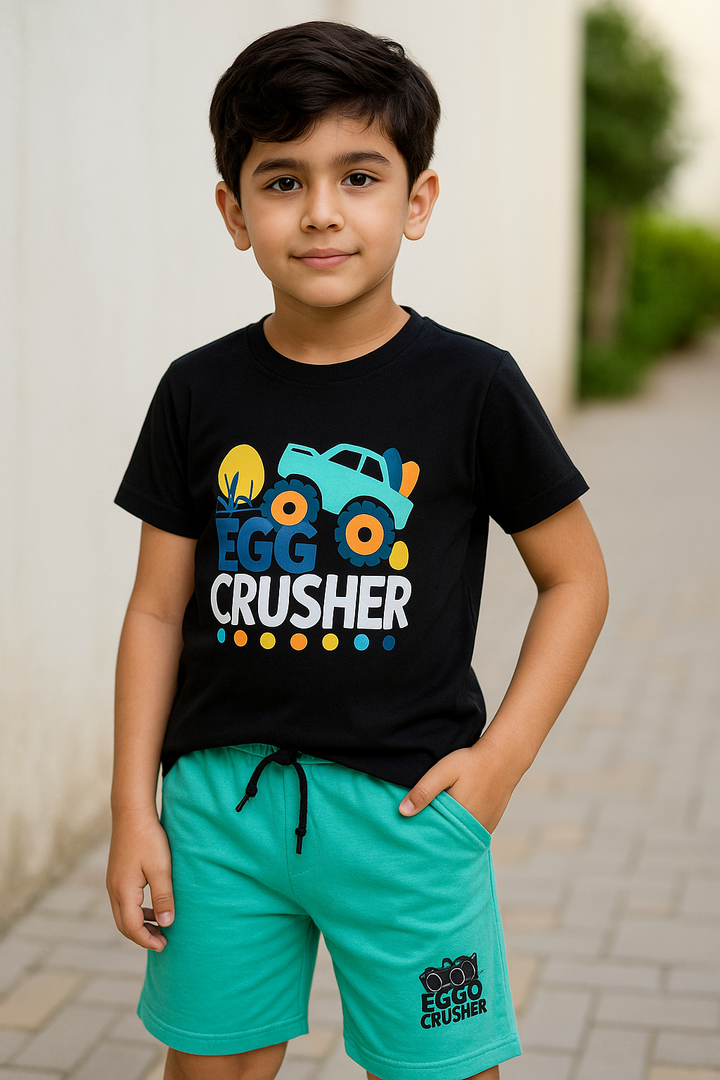 An ultra-soft, premium quality Black Egg Crusher 2 pc set kids best thing 2-piece set consisting of a cotton jersey fabric T-shirt and shorts by KidsCouture. Non-allergic fabric, gentle to baby's skin. Perfect for the summer season.